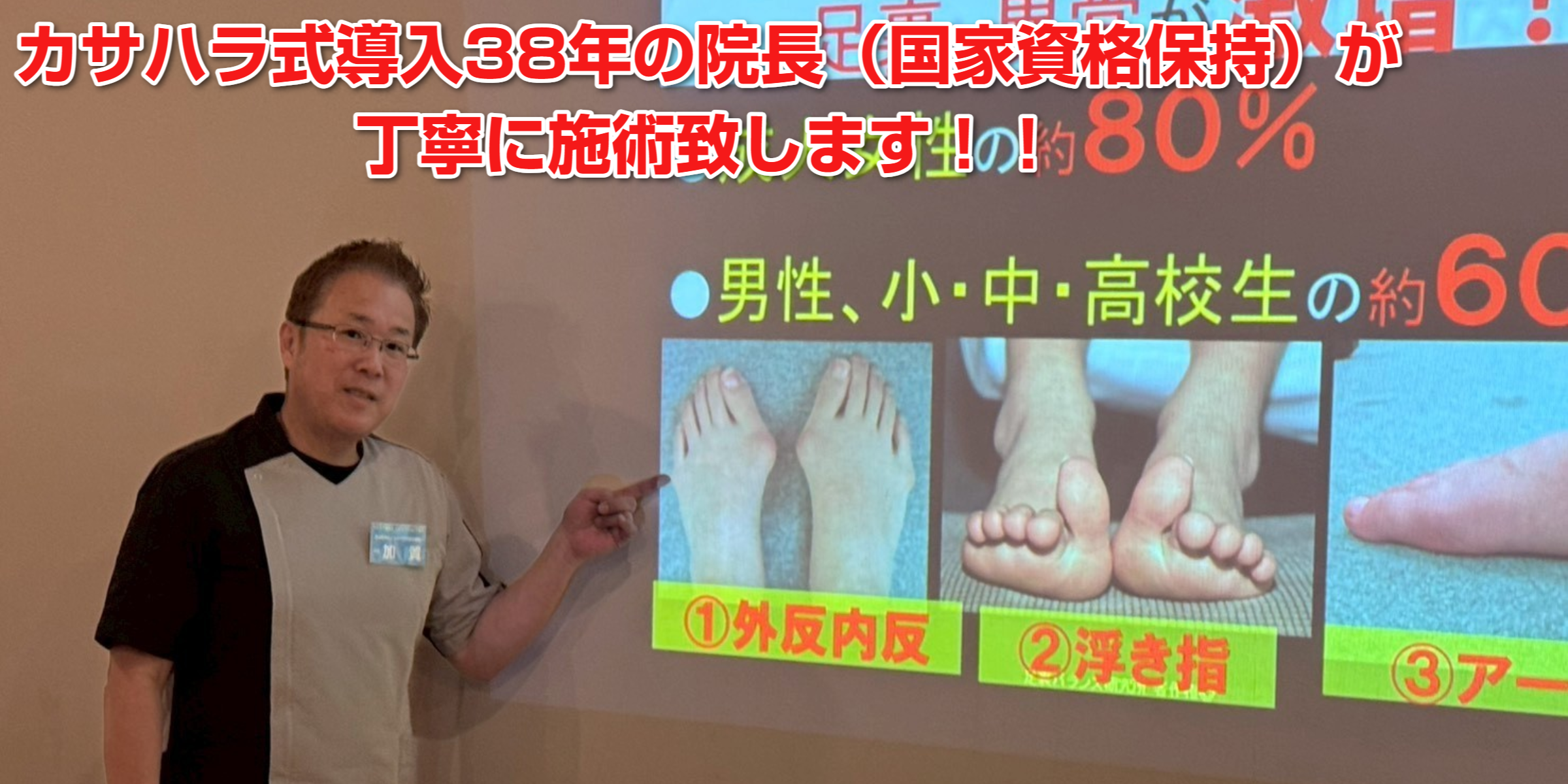 カサハラ式認定講師の院長は、開業後38年(整骨院開業歴33年)で延べ10万人以上の足を診てきた身体のベテラン!
