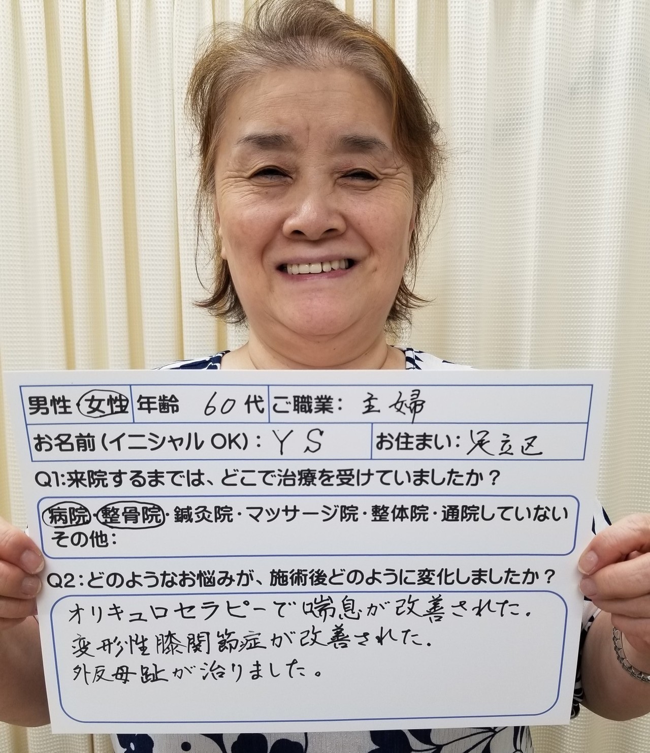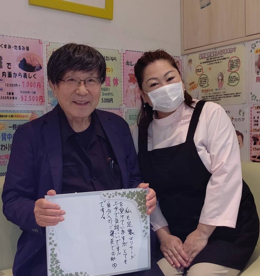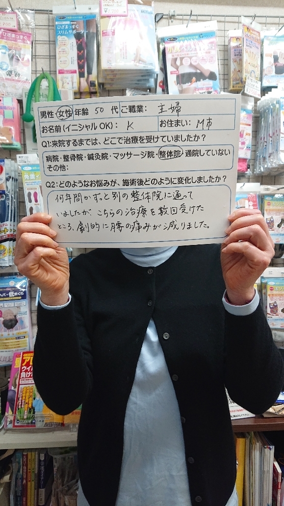 <患者さまの声⑦>今まで、何件も医療機関を転々としてきて、治らないものと諦めていましたが、友達の紹介で一度連れて行ってもらい、自宅で、自分でケアするためのサポーターやインソールを購入して、先生の指導通りに運動していたら、3ヶ月位から明らかに痛みの質が変わり、歩くスピードが早くなりました。今後も頑張って続けて行きたいと思います。足がもう少し良くなったらたまには通院したいと思います。