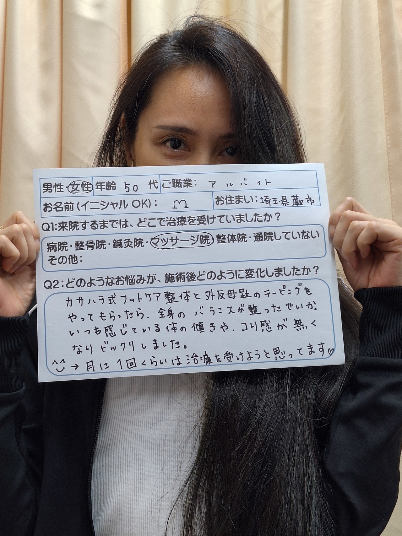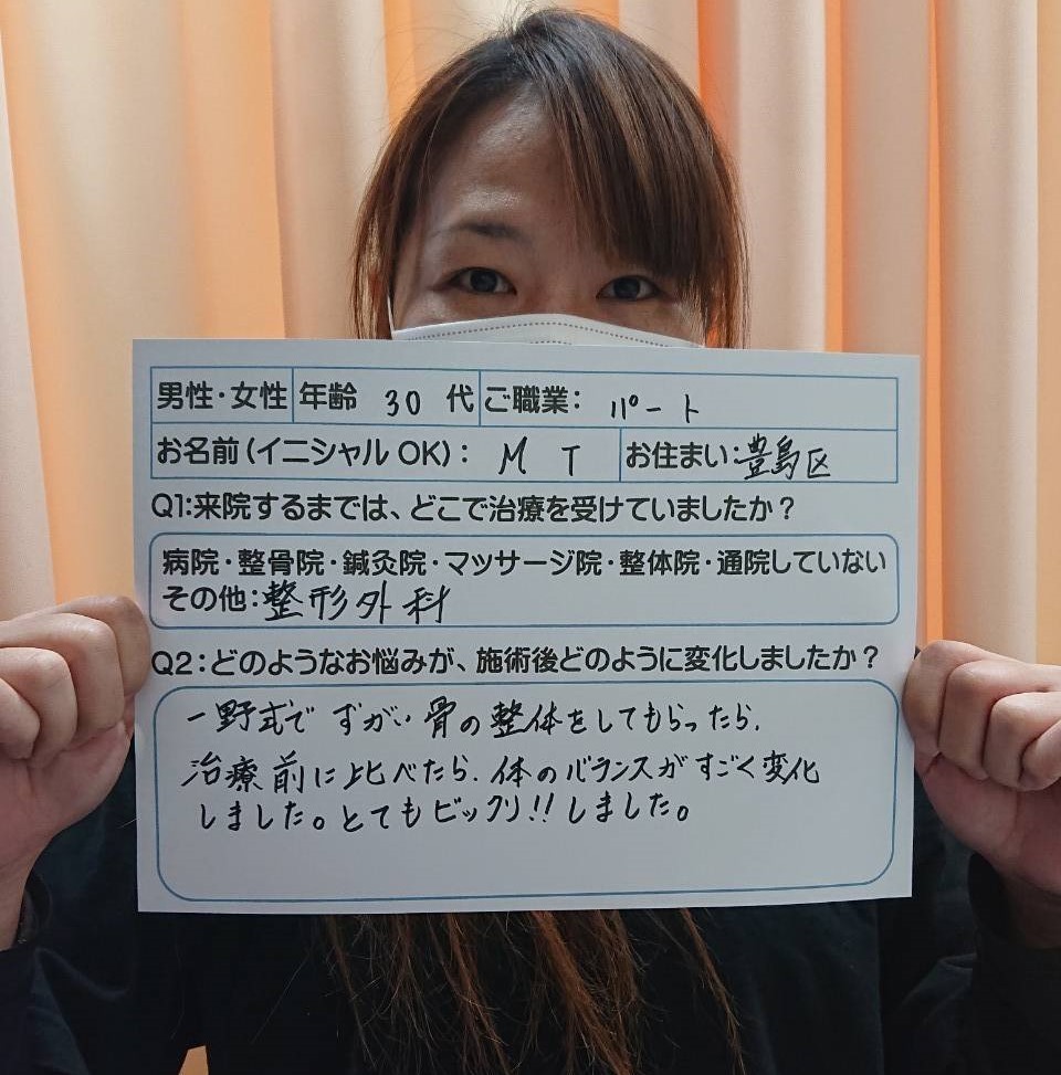 <患者さまの声②>下半身太りに悩んでいて、これまでにエステやダイエット、ジムでのトレーニングなどをしてきましたが、カサハラ式亀有店さんに来て、足に問題があり、そこから下半身太りが起こっていると聞かされとても納得しました。ウォーキングやジョギングの時の足の使い方も指摘されて、今までの使い方では足を太くすることが分かり、来て良かったと思いました。