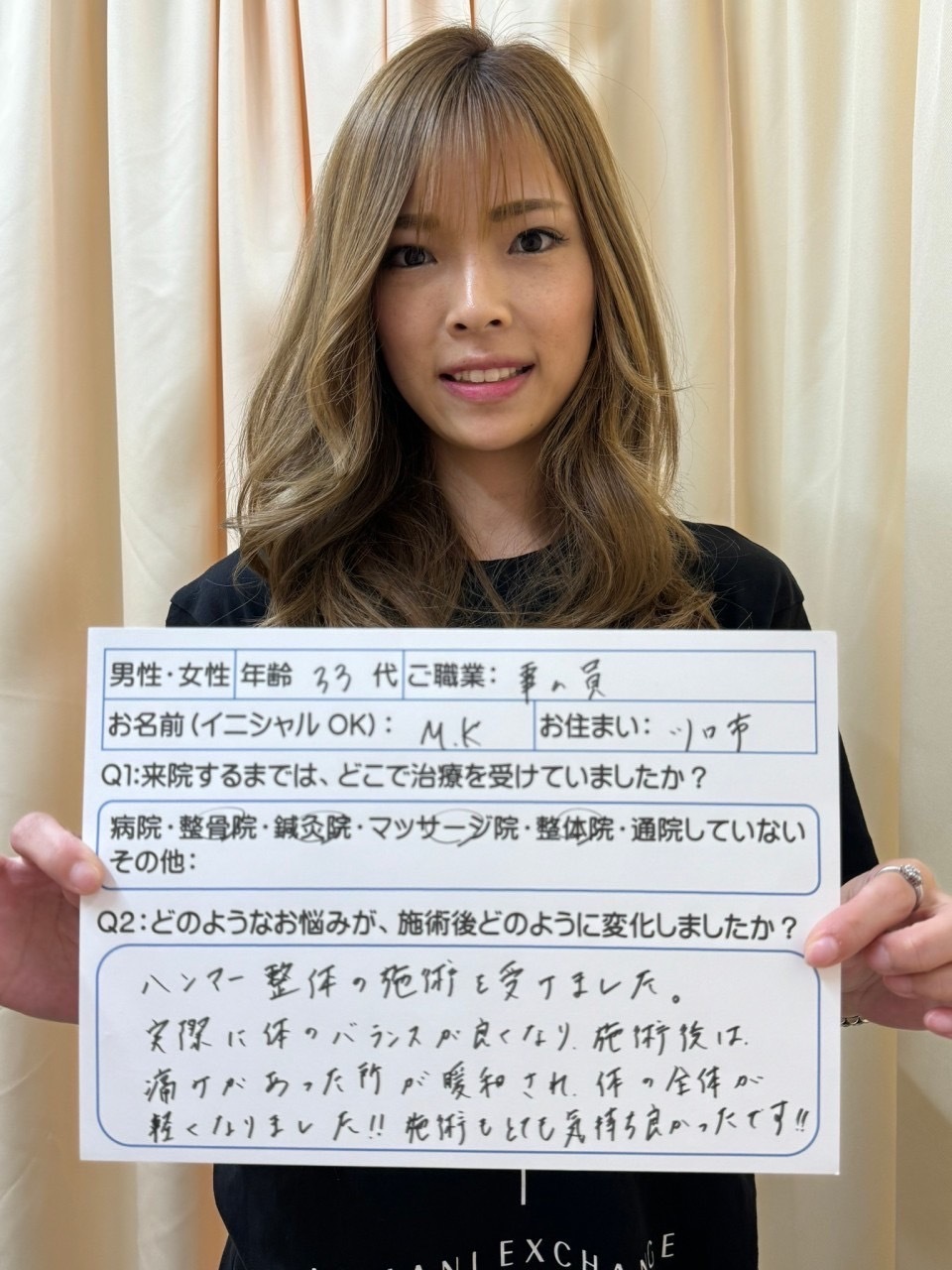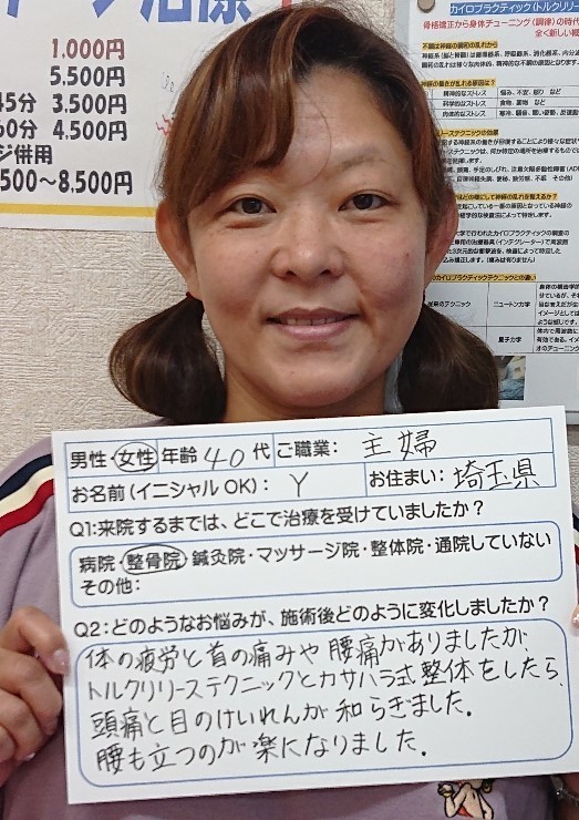 <患者さまの声①>医療機関を何件も回っても結果がおもわしくなく、行き着いたのがカサハラ式で、最初のカウンセリングで、始めて納得のいく説明を受けた感じがしました。その後は真面目に通院し、現在は卒業間近です。