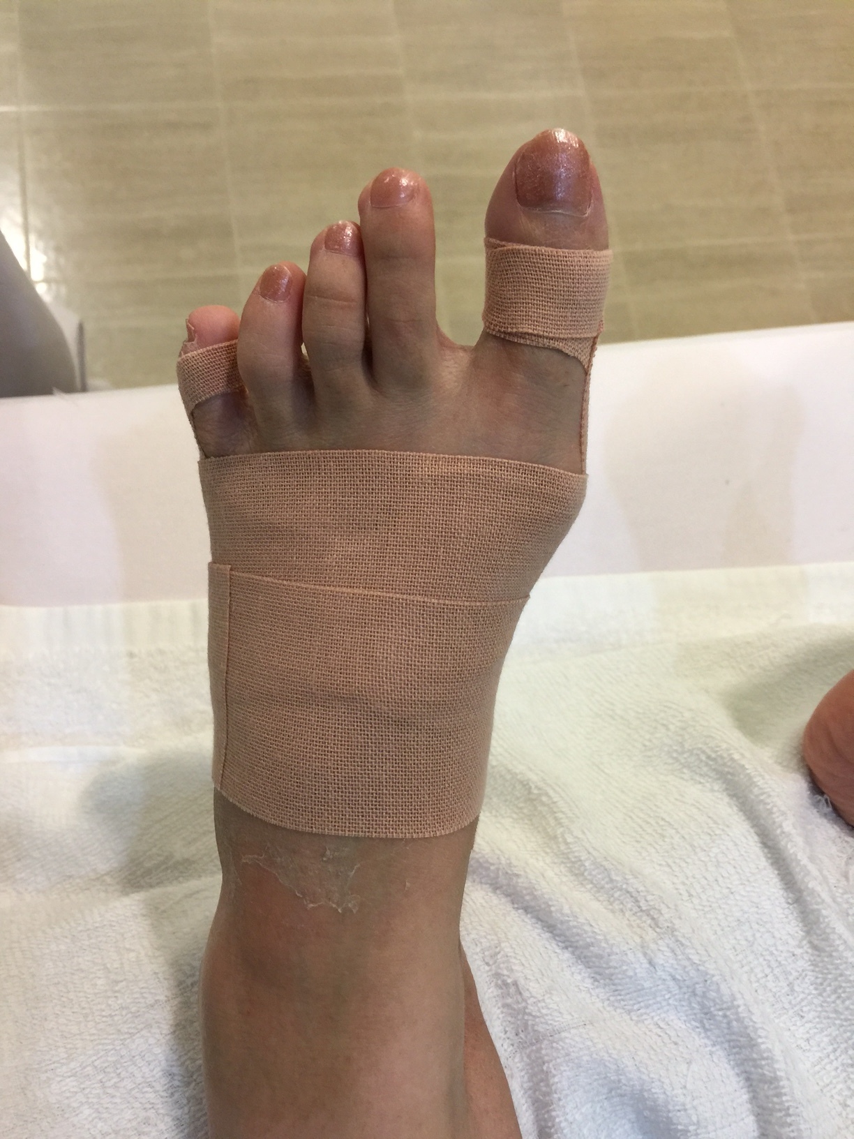 指が重なったままでは、正しい踏ん張りが出来ず不安定となり転倒の恐れがあります。テーピングで矯正し正しい形で足指を使って頂き、正しい歩行、他に当院独自の運動指導等で使える指に戻して行きます。どんな変形でも諦めずに先ずはご相談下さい!!