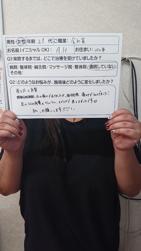 <患者さまの声④>足裏の指の付け根が痛く、針で刺されるような痛みがあり、近隣の数件の医療機関をはしごしましたが、段々と痛みが強くなり困っていたところ、ホームページでカサハラ式亀有さんを見つけで受診しました。かなり状態は進行していたようですが、初めて納得のいく説明を受けたので、現在通院1ヶ月目で、痛みはかなり楽になりました。根本的に強い足にするにはもう少し通院が必要みたいなので、再発したくないから頑張ります!