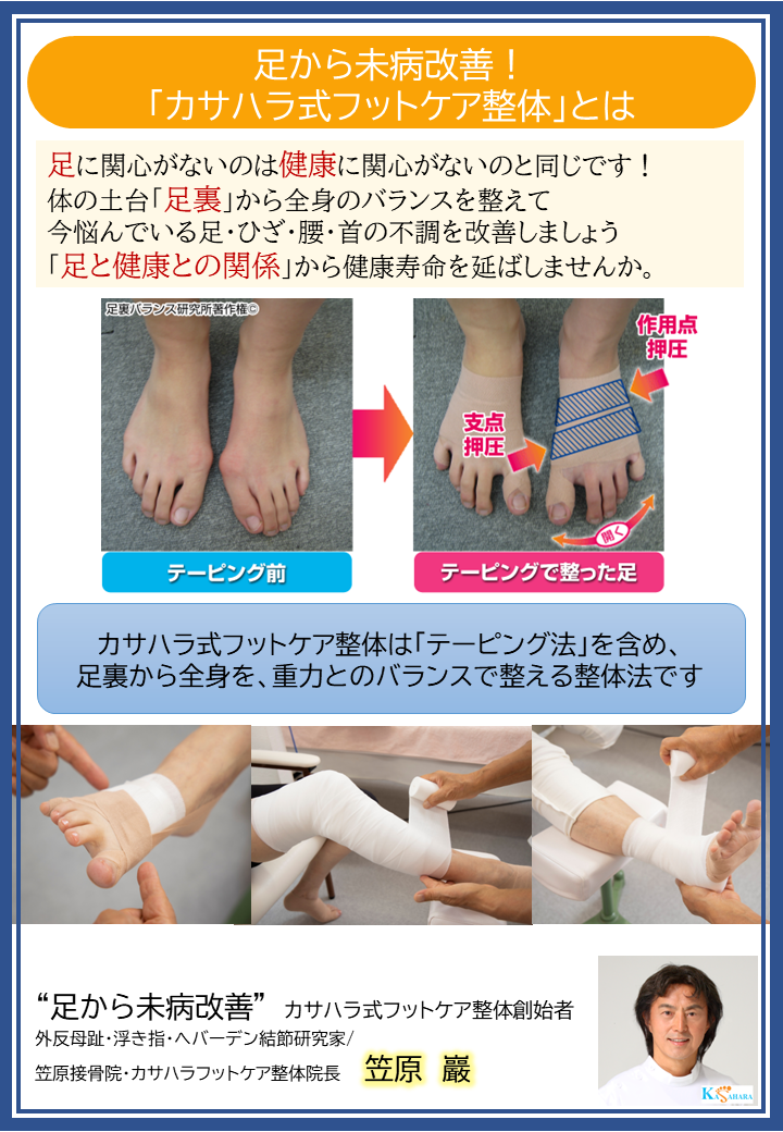 ※注意!!最近カサハラ式と類似したテーピング療法を行うフランチャイズ店舗が増えておりますが、カサハラ式ではありませんのでお間違いのないようにお願い致します。外反母趾矯正テーピングの元祖はカサハラ式です。(当院は回数券制ではなく、その都度払いとなっております)